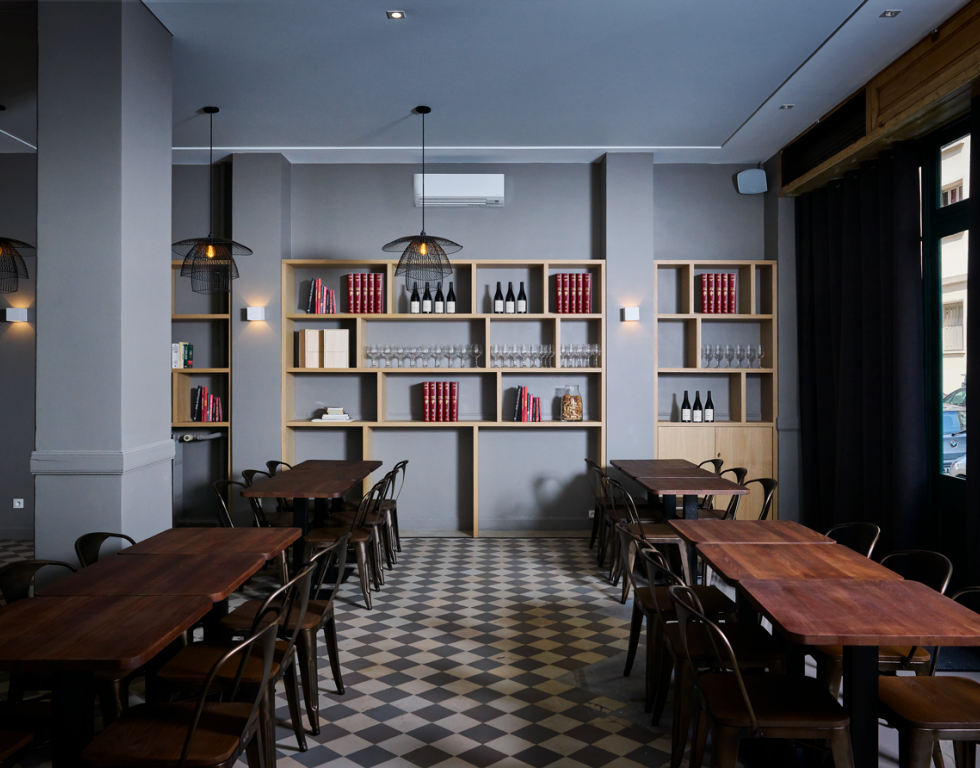 Aménagement d’un local commercial au rez-de-chaussée, en un lieu de rencontre autour de la dégustation du vin, organisé en 3 zones: